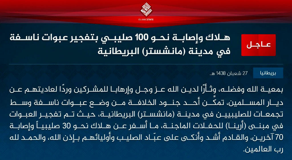 La rivendicazione dell’Isis dell’attentato di Manchester recita: “Uno dei soldati del Califfato è riuscito a posizionare ordigni esplosivi in mezzo a un raggruppamento di crociati nella città britannica di Manchester, dove è avvenuta l’esplosione nell’edificio Arena che ha causato la morte di 30 crociati e il ferimento di altri 70. Per chi venera la Croce e i loro alleati il peggio deve ancora venire. Sia lode al Signore”. Nel comunicato rilanciato dall’agenzia Amaq non si parla quindi di kamikaze.