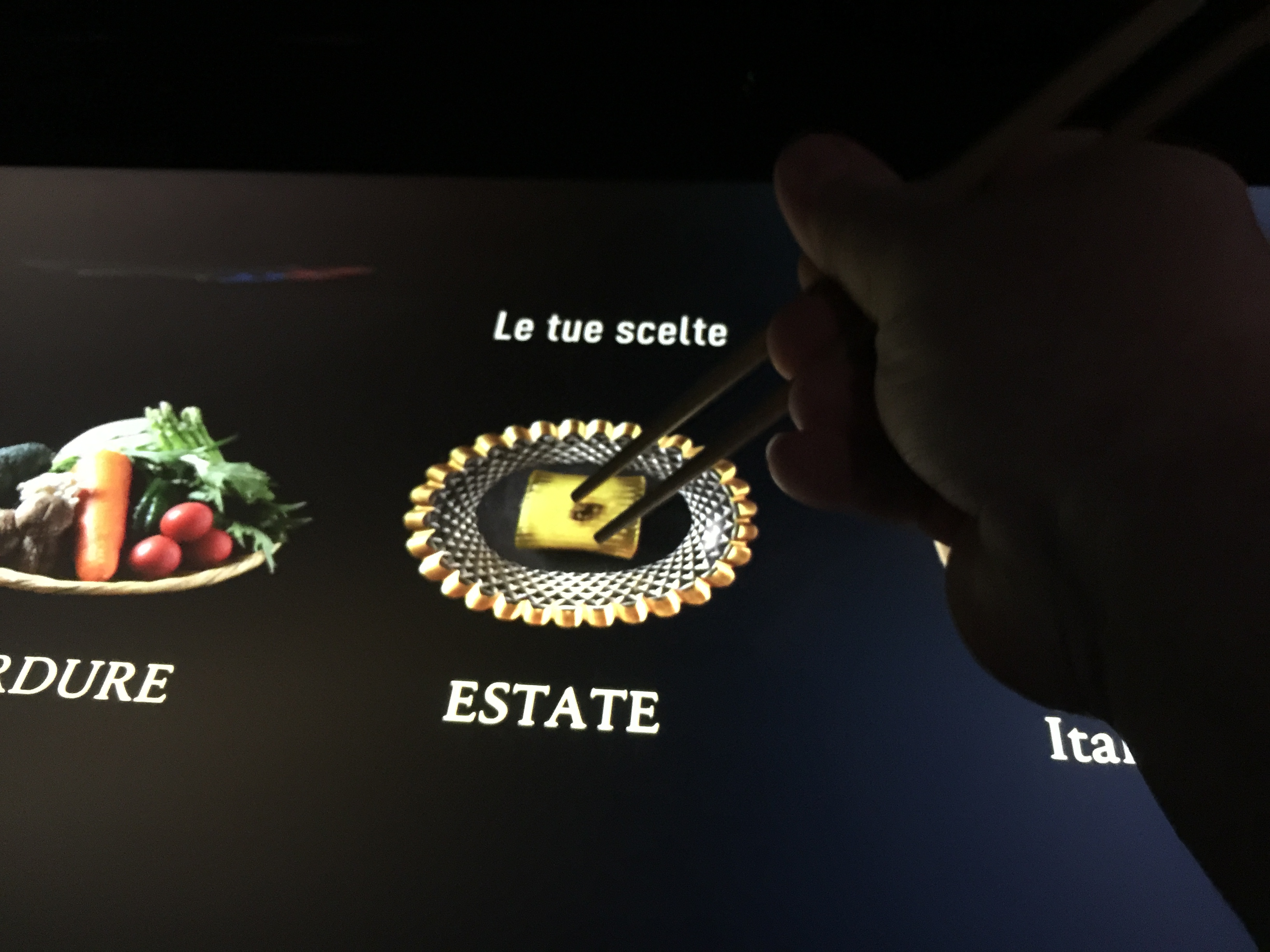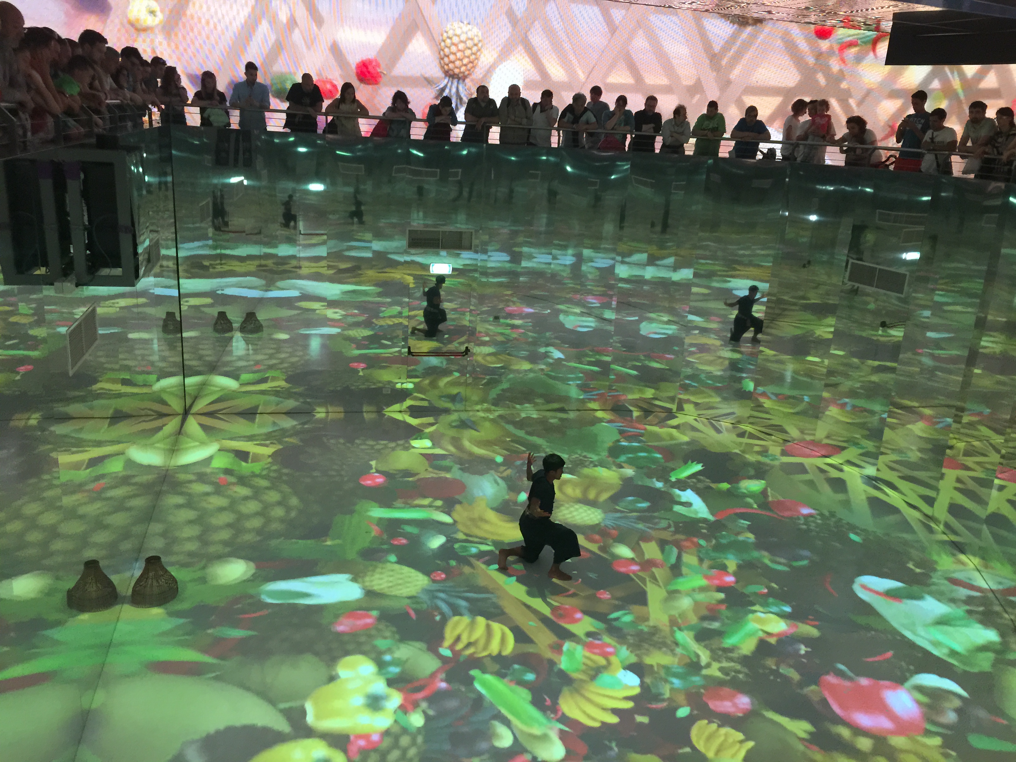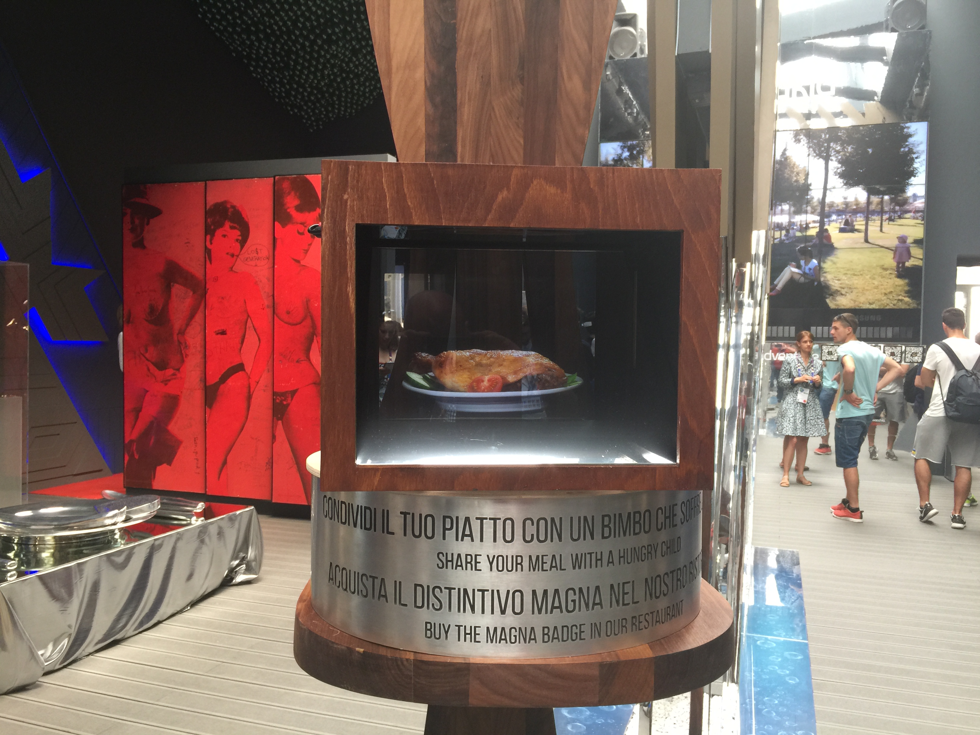 Finalmente si arriva a un padiglione interessante, quello giapponese. E infatti c’è un’ora di coda. Ma la vale tutta. Bello, molto tecnologico, ma poetico allo stesso tempo, nella prima sala ti ritrovi “dentro” a un video, nella seconda puoi servirti all’albero del nutrimento scaricandoti alimenti virtuali sullo smartphone, nel terzo vieni fatto accomodare in un ristorante virtuale, in cui le bacchette sono dei mouse, e i piatti degli ipad. Bello bello bello.