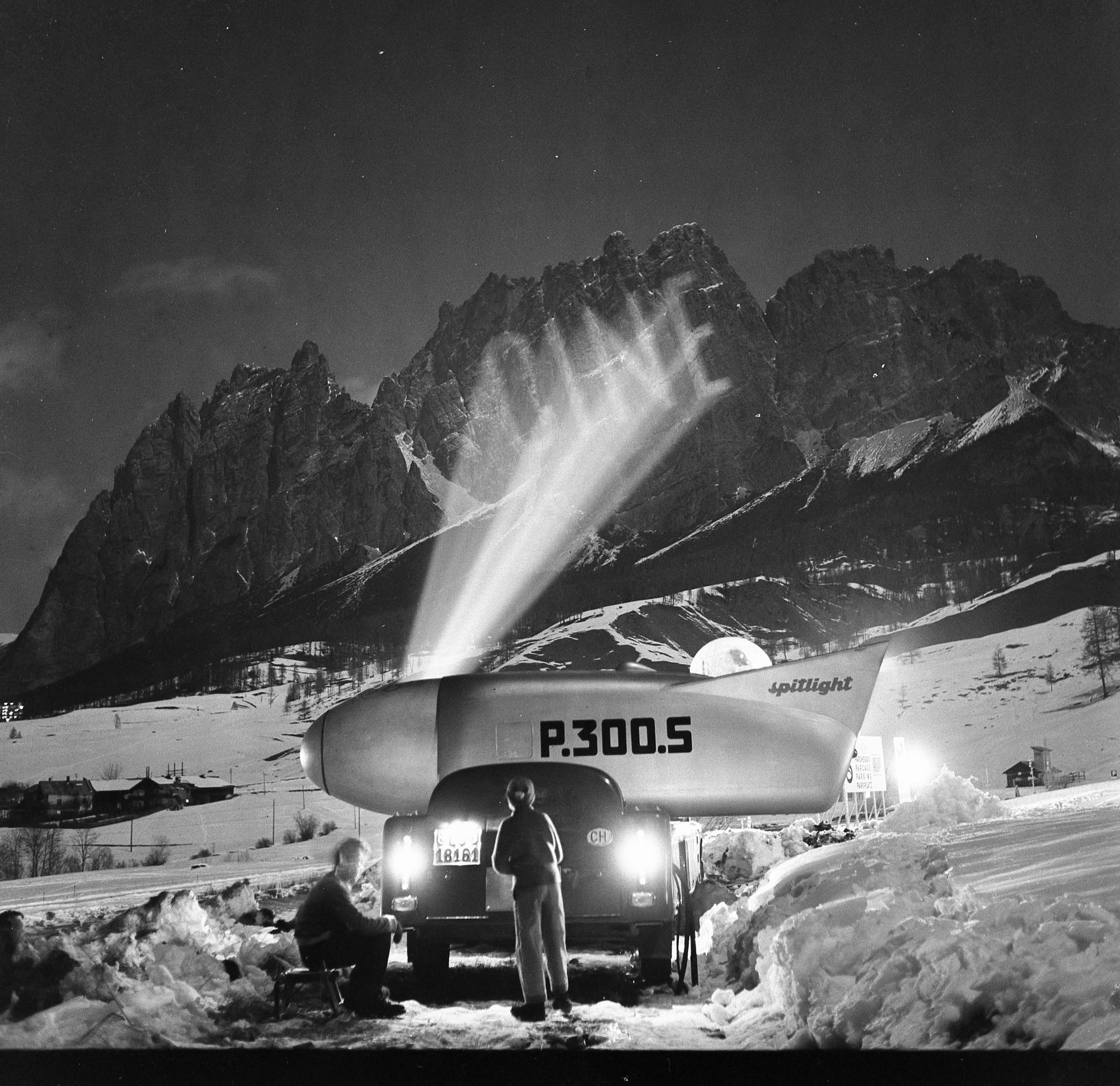 L’artefice di questo spettacolo era l’ingegnere ticinese Gianni Andreoli, coadiuvato da un’equipe di specialisti. Ogni sera parcheggiava il camion rosso fiammante con lo sputa luce, traduzione letterale di Spitlight, poco sopra Cortina d’Ampezzo per dare inizio alle proiezioni. “La vetrina sportiva doveva fare da rampa di lancio della sua invenzione. Dalla valle nelle Dolomiti, Gianni Andreoli ritornò invece molto amareggiato”, racconta Felix Wirth, storico e coautore del libro fotografico sullo Spitlight intitolato Vision of a visionary – Die unglaubliche Geschichte des Spitlight P.300.SCollegamento esterno.