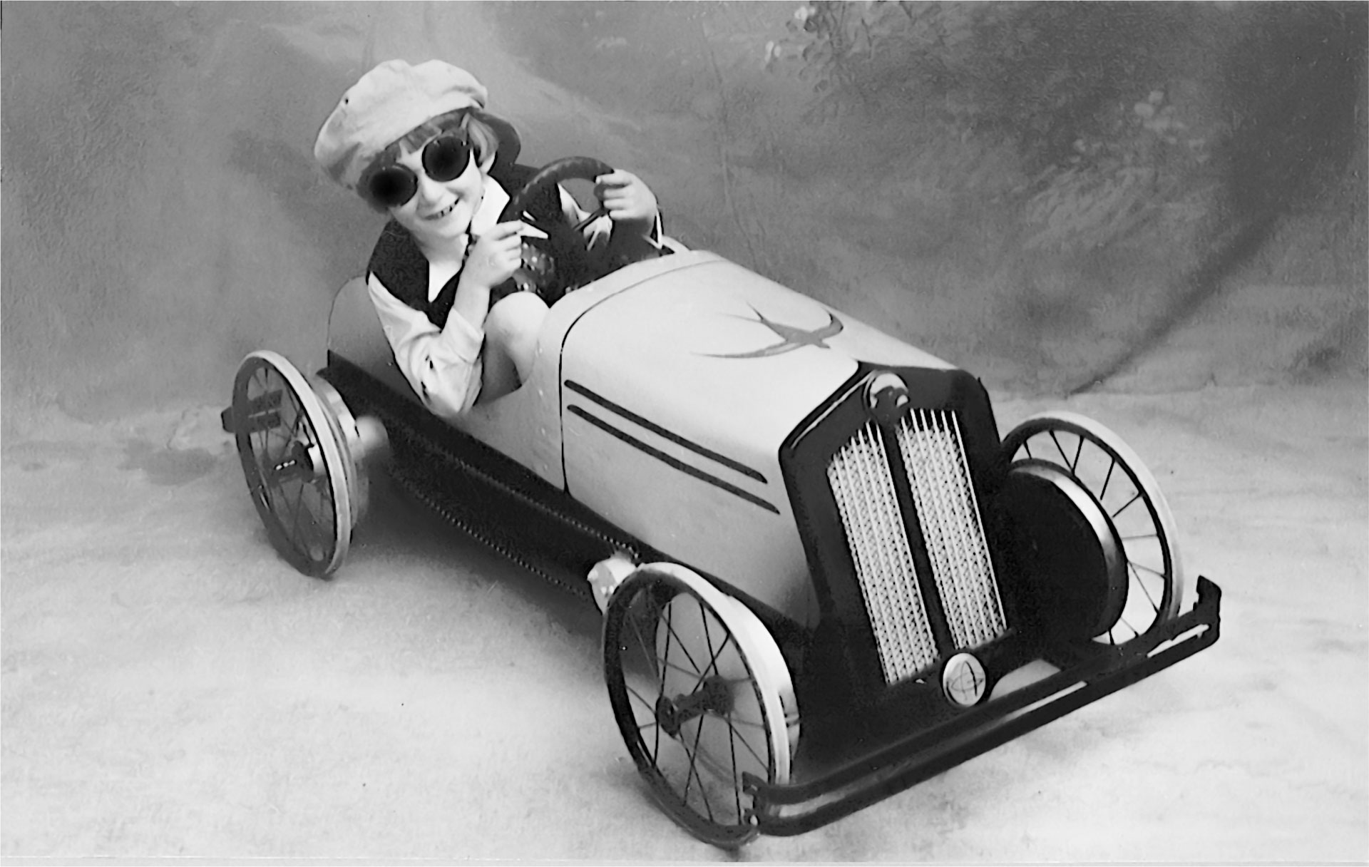 Gianni Andreoli in una delle sue macchine di legno fai-da-te, intorno al 1930 © Fondazione ENTER Soletta