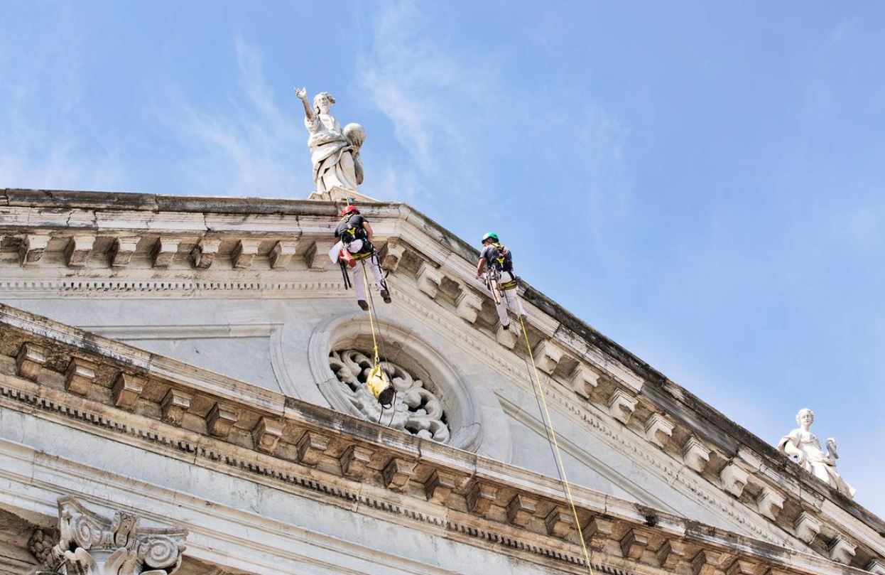 Uomini ragno, ovvero restauratori professionisti abilitati al lavoro su fune, si sono calati dalla cima dell’edificio per controllare, mappare le criticità architettoniche e rimuovere sia le pietre mobili pericolanti che i detriti e le erbacce. Questa attività è propedeutica ad un vero e proprio intervento di restauro che Pro Venezia aveva già realizzato tra il 1976 e il 1979.