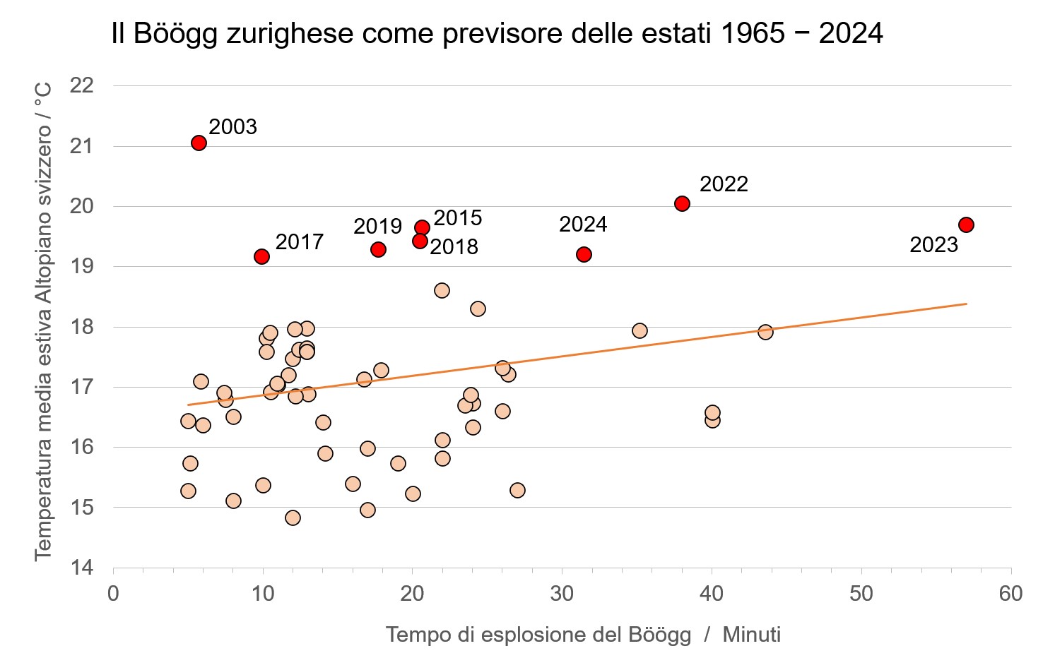 “Prima della seconda estate più calda del 2022, il Böögg esplose dopo quasi 40 minuti. Prima della terza e quarta più calde del 2018 e del 2015, il tempo di combustione fu tra i 20 e i 21 minuti. In questi tre anni, il Böögg fu un pessimo previsore. Anche nel 2019, con la quinta estate più calda mai registrata, non diede una previsione accurata, bruciando per poco meno di 18 minuti.”