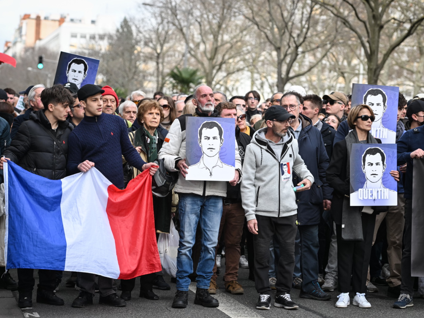 Intanto, dopo un’ora di marcia, il corteo è arrivato sul luogo del linciaggio e i partecipanti hanno cominciato a scandire “Giustizia per Quentin”. Alcuni manifestanti hanno dispiegato uno striscione con la scritta “Adieu camarade”, addio compagno, mentre una decina di loro hanno innalzato fiaccole. La marcia si è quindi conclusa; gli organizzatori hanno chiesto una dispersione dei partecipanti senza incidenti, tutti si sono allontanati fra gli applausi e intonando la “Marsigliese”.