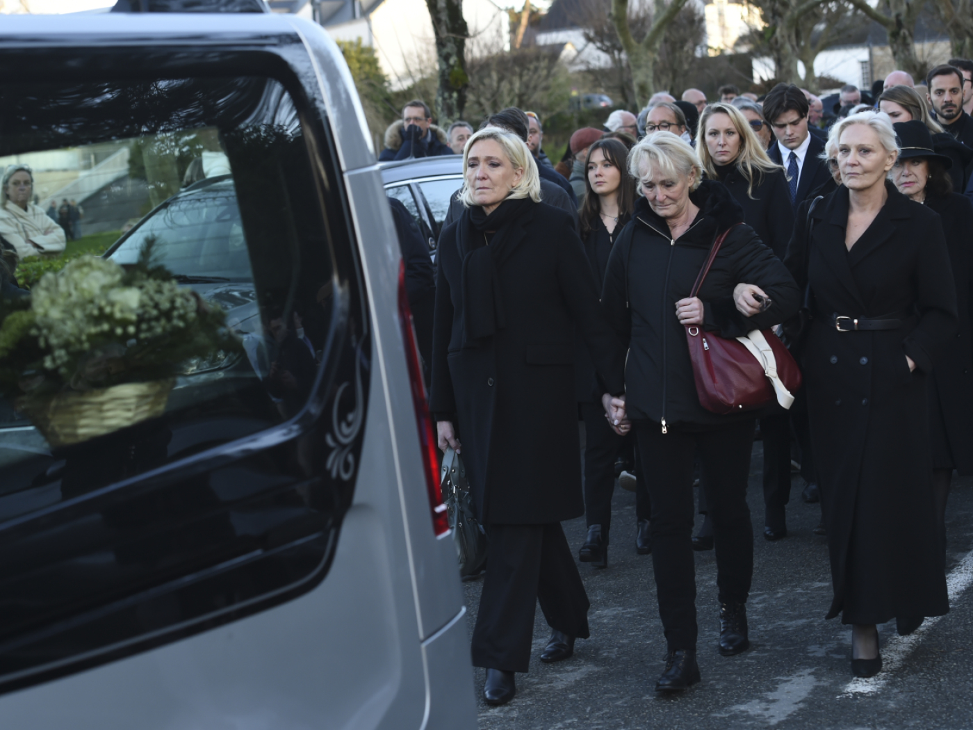 Marine Le Pen e una delle sue due sorelle, Marie-Caroline, seguite da diversi membri della famiglia, hanno percorso a piedi le poche centinaia di metri che separano la casa di famiglia dalla piccola chiesa di Saint-Joseph, davanti a una piccola folla di curiosi e a diverse decine di giornalisti tenuti a distanza.
