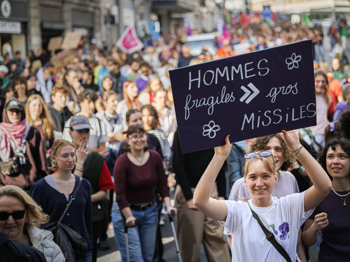 “Nessun femminismo senza antimilitarismo. Nessuna pace senza giustizia sociale”, ha scandito un membro del collettivo vodese, riferisce una giornalista dell’agenzia Keystone-ATS presente sul posto. “Sostegno a tutti i popoli che resistono”, le ha fatto eco un’altra manifestante.