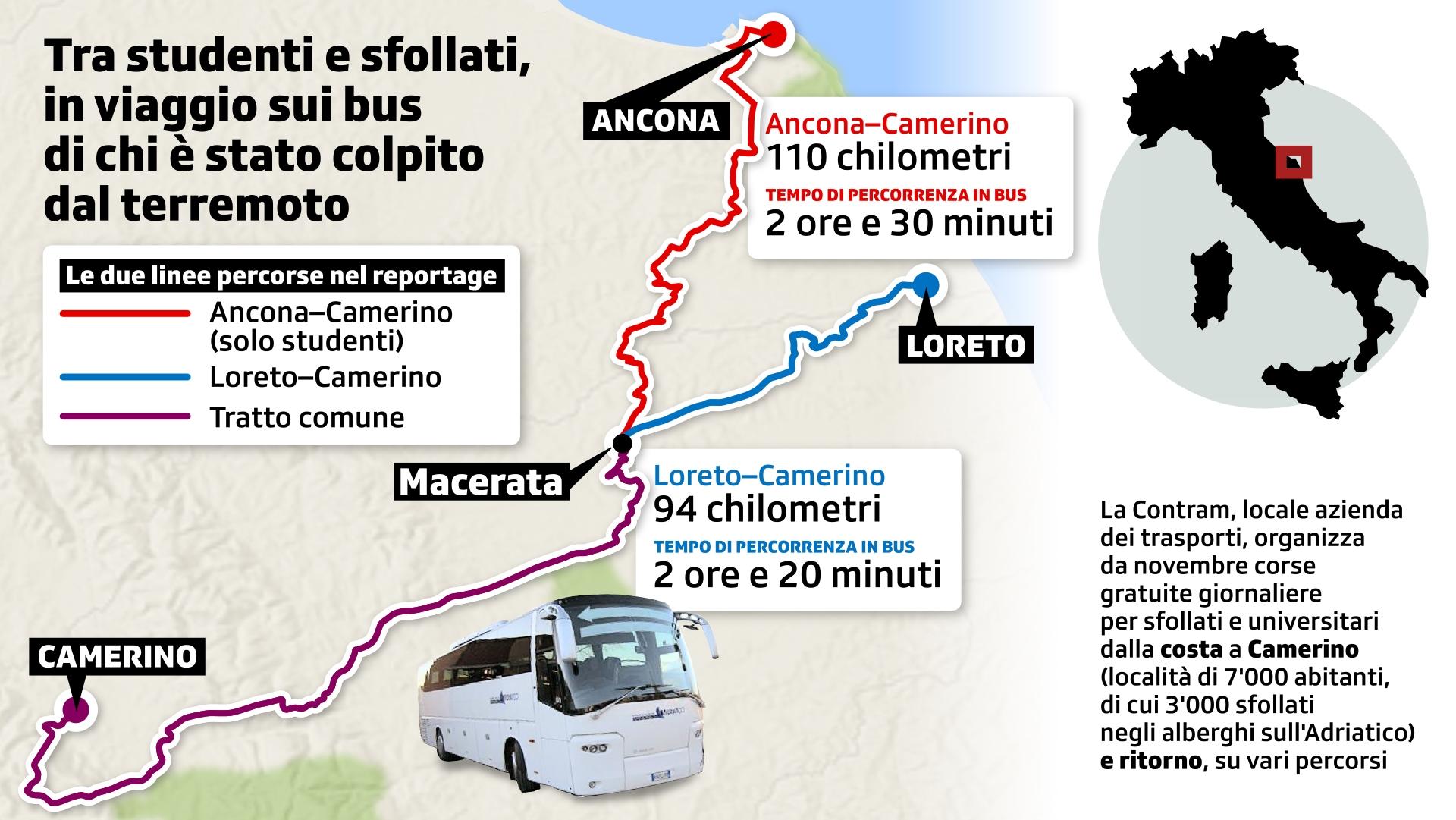 Da novembre la Contram, azienda locale dei trasporti, organizza corse giornaliere gratuite per sfollati e universitari dal litorale all’interno. Siamo saliti sui suoi bus raccontando le storie di chi, per via del sisma, si ritrova costretto ogni giorno a fare la spola tra l’Adriatico e i monti Sibillini, dove Camerino e le frazioni limitrofe sorgono. Due ore di viaggio all’andata, altre due al ritorno. E anche per gli autisti un po’ la vita è cambiata.