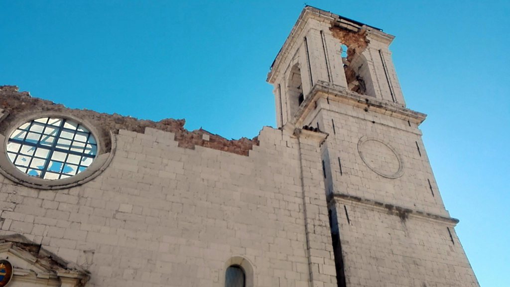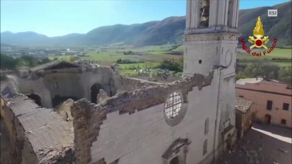 I danni alla basilica di Norcia ripresi dall’alto (EBU)