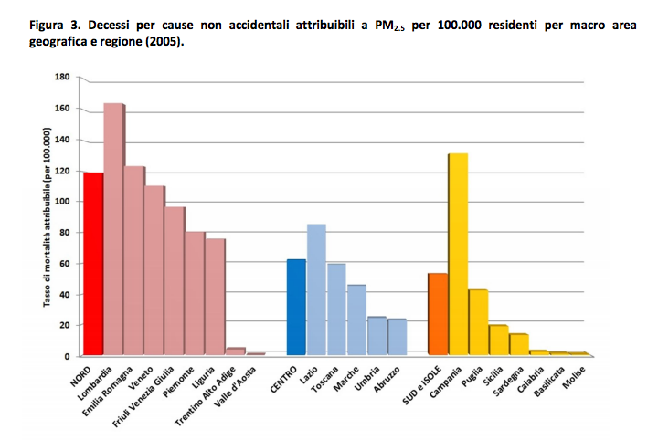Lo dice l’ultimo studio curato dal Ministero della Salute: chi abita a Nord perde 14 mesi di vita, mentre l’incidenza dei decessi per cause non accidentali e attribuibili a PM2.5 (le microparticelle inquinanti) è pari a 120 su 100.000 residenti.
