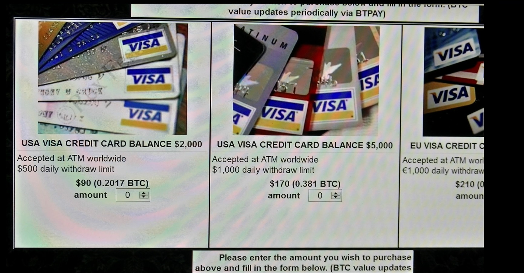 Scorrendo le pagine abbiamo trovato: armi che manco in un film d’azione,carte di credito clonate e conti pay pal rubati con il saldo di ognuno riportato in pagina come sul menu di un ristorante, droghe e farmaci di ogni tipo, banconotecontraffatte (20 e 50 euro vanno per la maggiore), documentid’identità falsificati e persino le istruzioni per costruire armi e ordigni esplosivi fai-da-te. Il tutto su pagine recensite dagli utenti e votate con tanto di stelline.