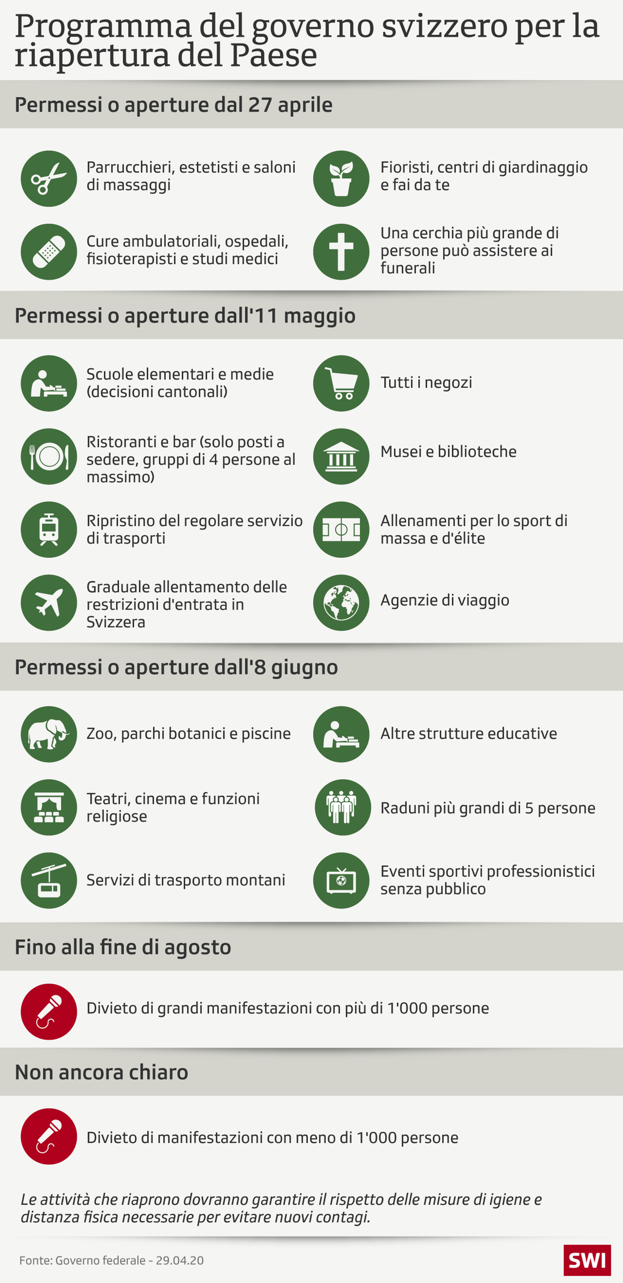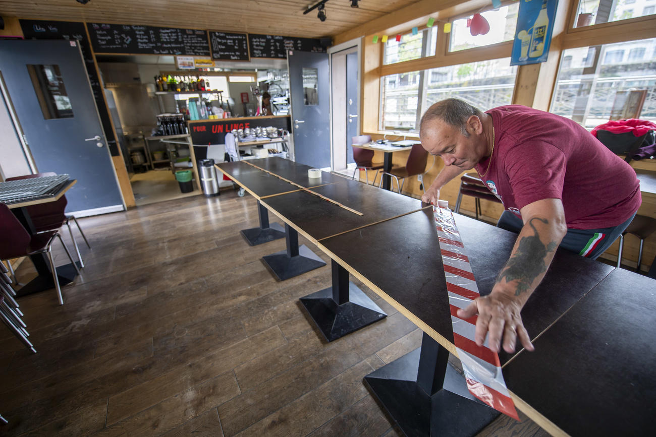 Una settimana fa il Consiglio federale (governo) aveva dato il via libera alla riapertura di bar e ristoranti “nel rispetto di severe condizioni” e con un preciso piano di protezione. Questo pianoCollegamento esterno è stato presentato martedì da GastroSuisse, l’associazione ombrello del settore, e si applica a tutti i caffè, ristoranti, bar e alberghi con posti a sedere, come voluto dal governo.
