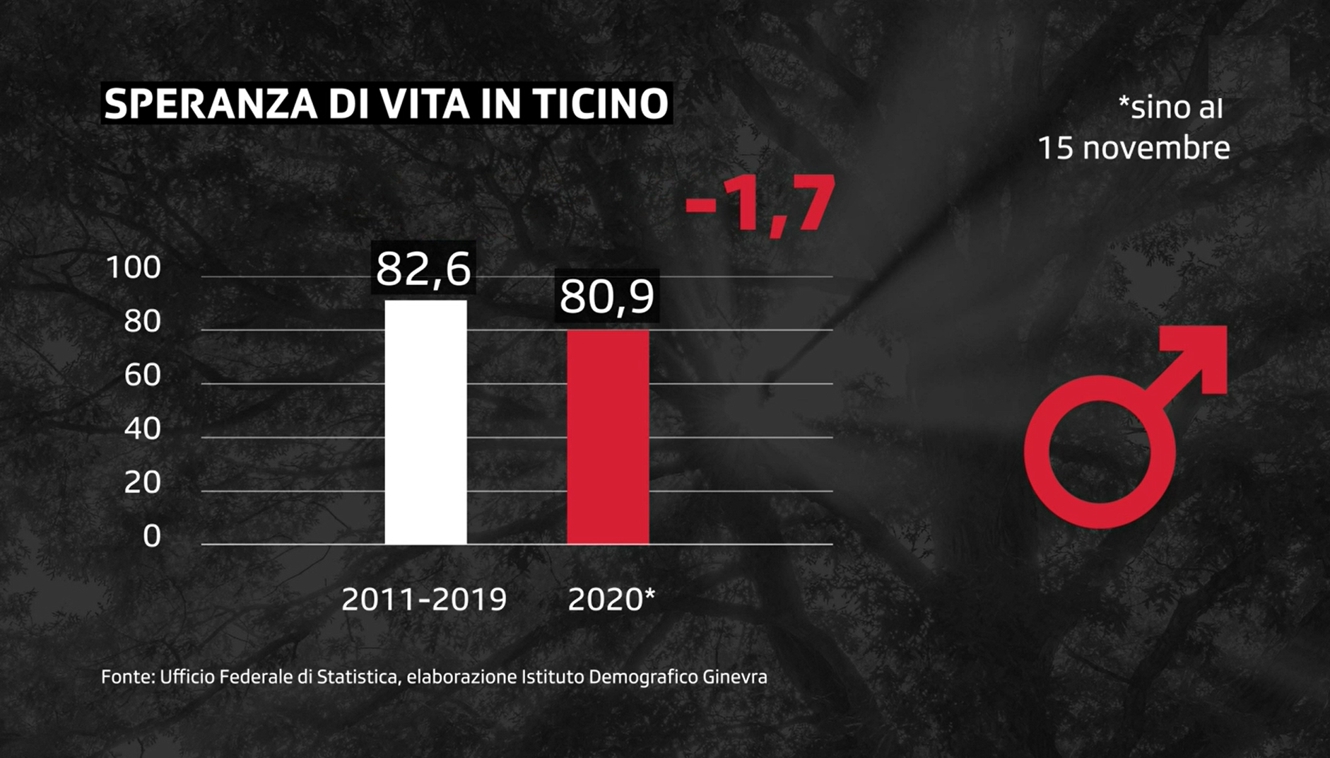 L'Istituto di demografia dell'Università di Ginevra calcola per il canton Ticino, nei primi undici mesi del 2020, un abbassamento fuori norma della speranza di vita. Un crollo così non si osservava da un secolo, chiarisce il direttore Philippe Wanner, ciò che dimostra che l'impatto del coronavirus va ben al di là di quello di una semplice influenza.