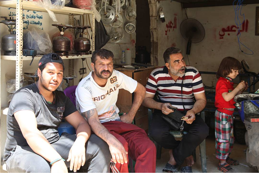 Immagine di una famiglia, riunita in un garage di Shatila.