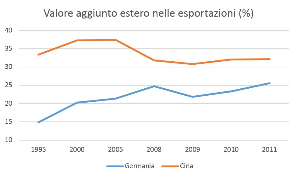 Deutsche Bank stima che in Germania un aumento del 10 per cento del valore aggiunto estero nelle esportazioni nazionali si traduce in un aumento dell’avanzo corrente dello 0,9 per cento. Se la percentuale di valore aggiunto estero nelle esportazioni tedesche continuerà ad aumentare come negli ultimi dieci anni – dal 14,8 al 25,5 per cento – la Germania si troverà sempre di più nel cuore degli squilibri globali, soprattutto perché in Cina, al contrario, aumenterà il valore aggiunto nazionale nel proprio export, già passato dal 65 per cento al 70 per cento nell’ultimo decennio.