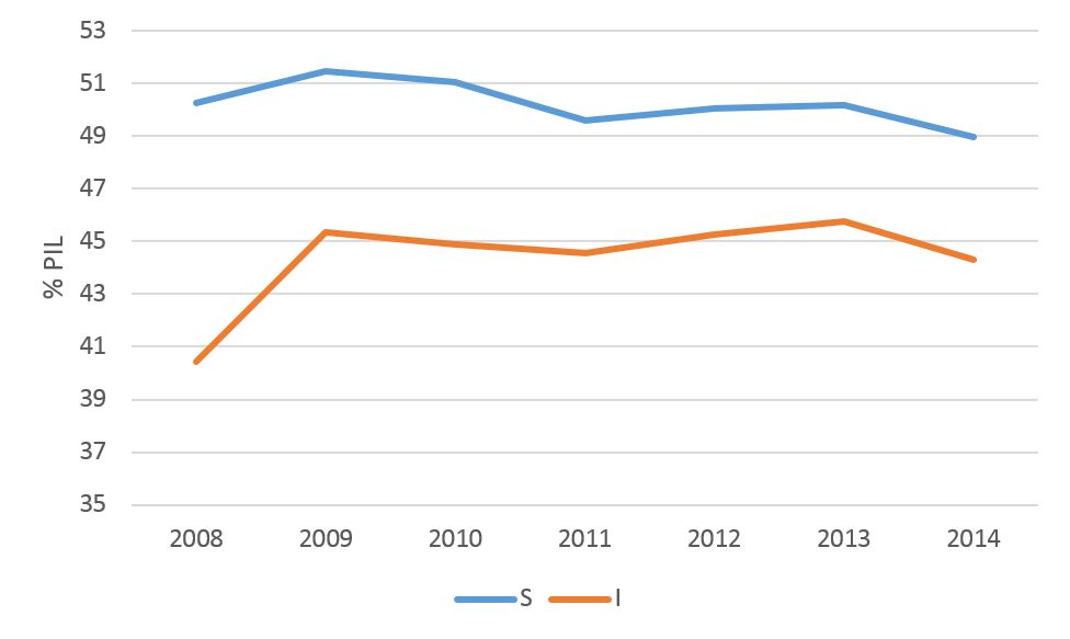 Ma c’è anche un ulteriore aspetto strutturale dietro le dinamiche dei saldi correnti. Secondo Johannes Brumm, Georgios Georgiadis, Johannes Gräb e Fabian Trottner (http://cepr.org/sites/default/files/(TROTTNER)_GVC_Participation_and_CA_Imbalances.pdf), l’aumento degli squilibri è in parte dovuto alla partecipazione delle imprese alle filiere internazionali. Quanto maggiore è il valore aggiunto estero nelle esportazioni di un paese, tanto maggiore sembra essere la percentuale di reddito d’impresa risparmiato. Infatti, quando le imprese sono competitive perché incorporano molti input importati in ciò che esportano, ritengono ‘temporaneo’ il guadagno di efficienza e pertanto accantonano gran parte dei profitti per motivi di tipo precauzionale. Viceversa, una buona competitività dell’export raggiunta prevalentemente con produzione nazionale, come nel caso cinese, è ritenuta più duratura.