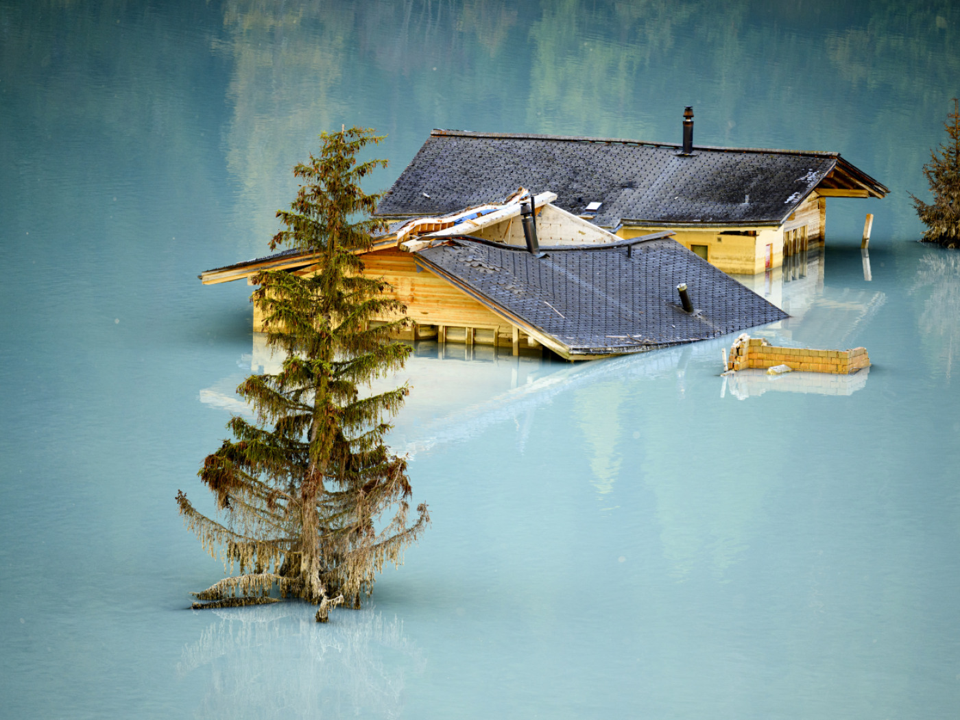(Keystone-ATS) La fotografia di Gillieron mostra due case sommerse che emergono come isole dal lago formatosi in seguito alla devastante frana che ha colpito la zona.